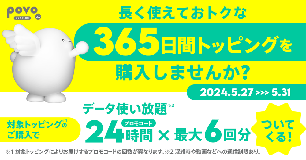 ・特典のプロモコードは、2024年6月中旬ごろまでに「povo2.0」に登録されているメールアドレス宛にお送りします。