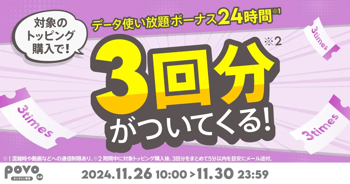 キャンペーン期間中に、対象のトッピングを購入すると、特典としてpovo2.0で利用可能な「データ使い放題※1ボーナス(24時間)」のプロモコードを3回分お送りします。