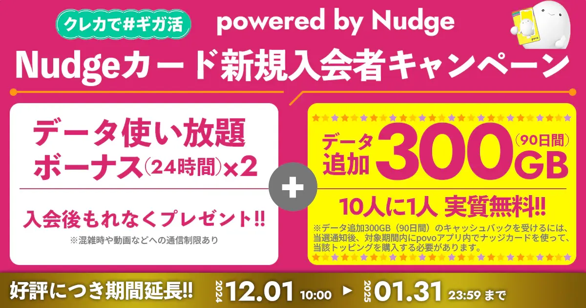 キャンペーン期間中に、Nudgeカードに新規でお申込みいただき、「povo」クラブを選択いただいた方のうち、10人に1人が対象になります。当選者へは、ナッジ社から個別ご連絡をし、期間中に300GB(90日間)のトッピングをご購入いただいた方へ、トッピングの購入金額を全額キャッシュバックします。