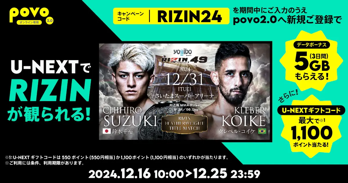 povo2.0新規加入時にキャンペーンコード「RIZIN24」を入力した方に、3日間使える5GB(=「データボーナス5GB(3日間)」)をプレゼントします。また、「U-NEXTギフトコード 1,100ポイント」か「U-NEXTギフトコード550ポイント」のいずれかが必ず当たる抽選を実施します。