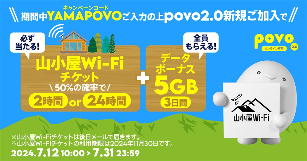 povo2.0新規加入時にキャンペーンコード「YAMAPOVO」を入力した方に、データボーナス5GB(3日間)をプレゼントします。また、山小屋Wi-Fiチケット(2時間)か山小屋Wi-Fiチケット(24時間)のいずれかが50%の確率で必ず当たる抽選を実施します。