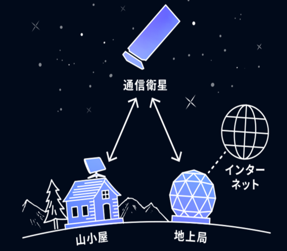 2023年にスタートした「山小屋Wi-Fi」は高度約500キロ上空の宇宙空間に存在する数千もの通信衛星(Starlink)と地上のアンテナをつなぐことでWi-Fiが利用できるKDDI㈱と㈱ワイヤ・アンド・ワイヤレス(Wi2)のサービスです。