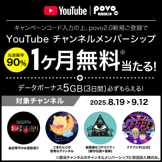 ・90%の確率(注)で「島田秀平のお怪談巡り」のYouTube チャンネルメンバーシップ1ヶ月分※(税込590円相当)が当たる!