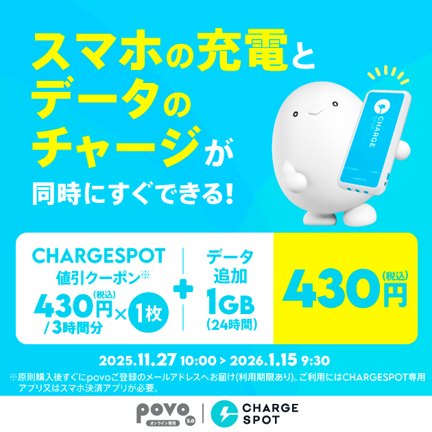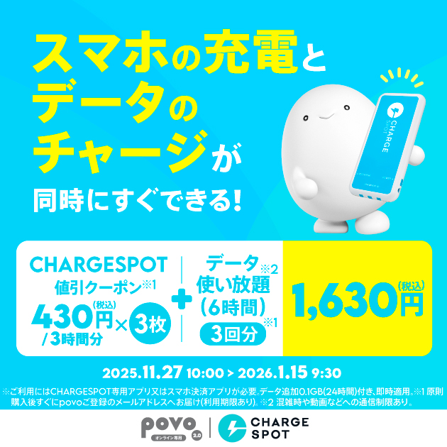 | 【期間限定】CHARGESPOT 値引クーポン(430円/3時間分)3枚+データ使い放題(6時間)3回分※2 | CHARGESPOT 値引クーポン(430円/3時間分)3枚※3 | 原則、ご購入後すぐにメールで送付 | 2026年2月28日(土) | 1,630円 |