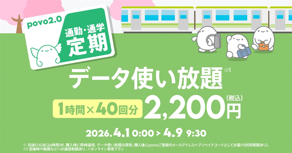 | 「プリペイドコードデータ使い放題※2(1時間)」40回分 | In principle, it will be sent by email immediately after purchase *3 | May 31, 2026 23:59 | 2,200円 (税込) |