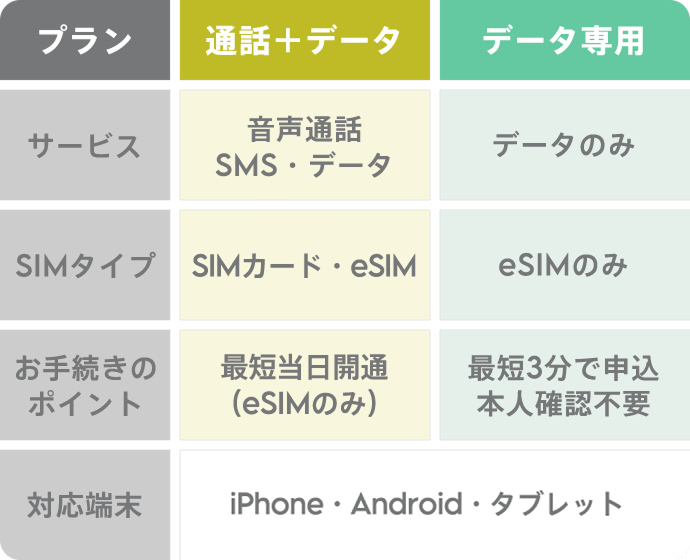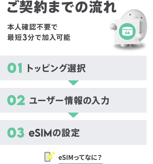 eSIMは埋め込み型のSIMでプロファイルと呼ばれるデータをダウンロードして利用します。オンラインで開通手続が可能なため、ご契約後お待ちいただかずにご利用できます。