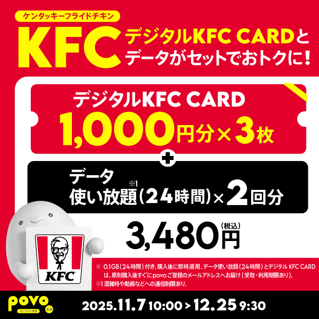 | 【期間限定】デジタルKFC CARD1,000円分×3枚+データ使い放題(24時間)×2回分※1 | デジタルKFC CARD1,000円分※2×3枚 | 原則、ご購入後すぐメールで送付 | 2026年1月8日(木) | 3,480円 |