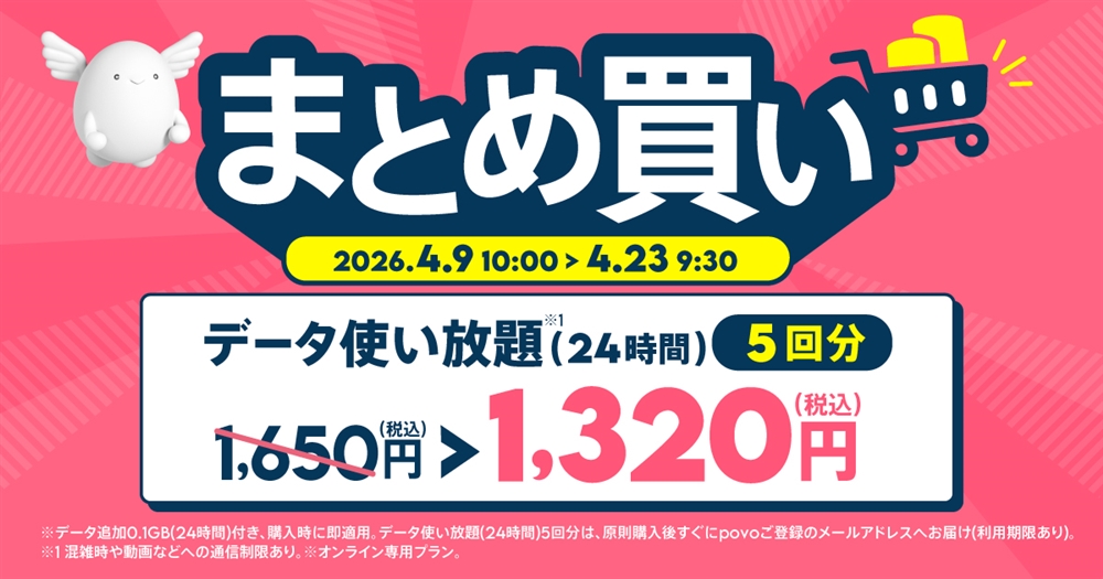 | 「プリペイドコードデータ使い放題※1(24時間)」5回分 | 원칙, 구입 후 곧바로 메일 송부 ※2 | 2026년 5월 31일 23시 59분 | 1,320円 (税込) |