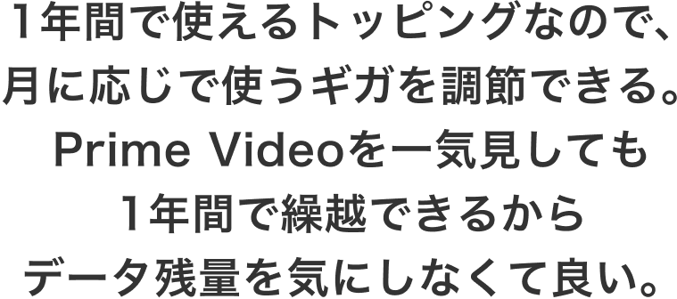●本トッピングのご購入後、データの利用状況に関わらず、購入日から365日後の23:59までは再度「Amazonプライム(1年間)」を含むトッピングをご購入いただけません。