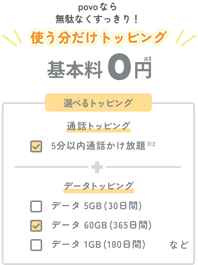 ※1 180日超の継続利用に一定の条件有。0円0GB時、最大128kbps。データ専用の 場合、契約時初回トッピング購入要。通話+データの場合、通話料等別途要。