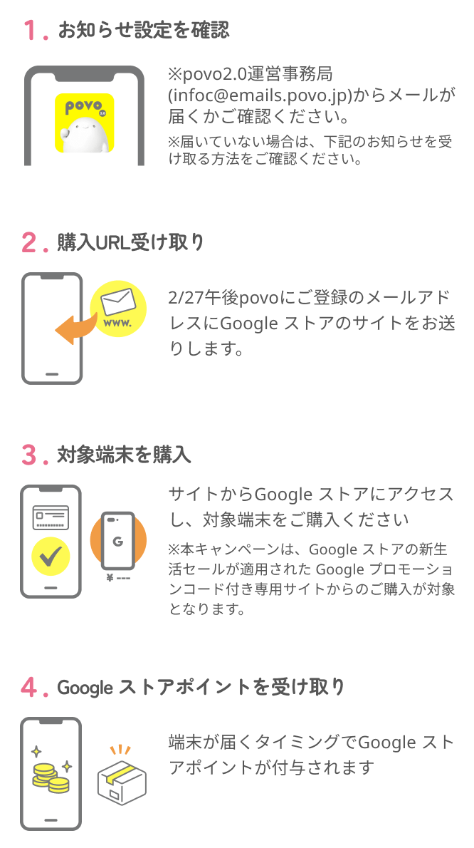 povoから届くリンクから Google ストアへアクセスし、対象端末ご購入後に GoogleからGoogleストアポイントが付与されます。