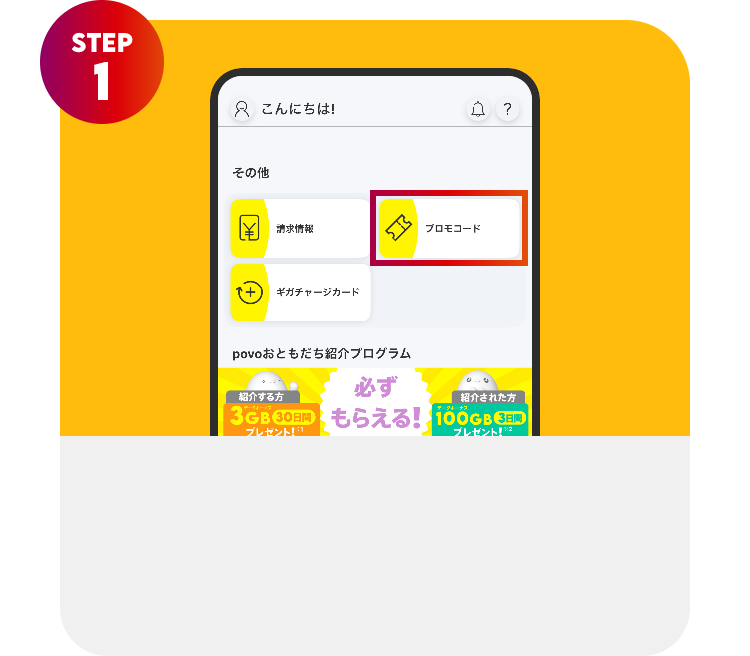 povo2.0アプリを開き、「ホーム」タブの下の方までスクロールし、「プロモコード」を選択します。