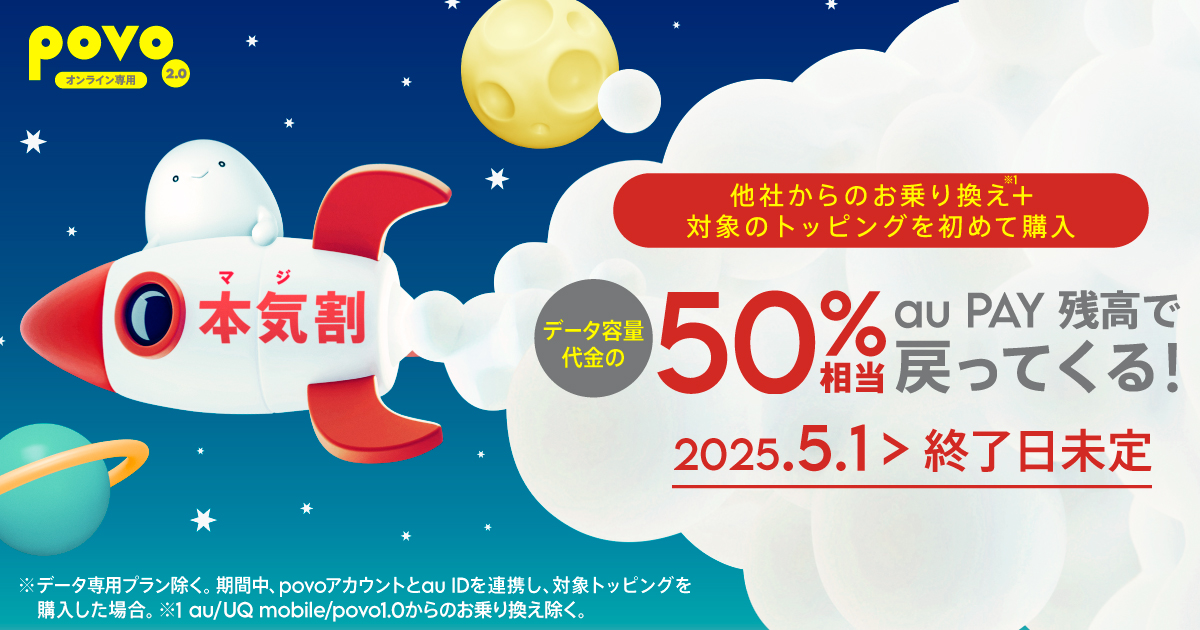 本キャンペーンの条件をすべて満たしているお客さまへSIM有効化の翌月末頃までにau PAY 残高チャージをさせていただきます。また、特典は対象トッピングを購入したpovoアカウントに連携されているauIDに紐づくau PAY 残高に還元いたします。