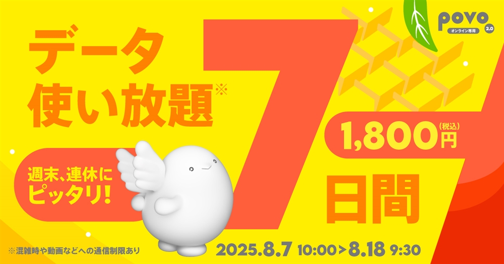 KDDI、沖縄セルラーは2025年8月7日から、povo2.0の期間限定トッピングとして「データ使い放題(7日間)」(注)を提供します。夏休み・お盆休みなどの旅行や帰省時にデータをたくさん使用する予定があるお客さまにおすすめです。