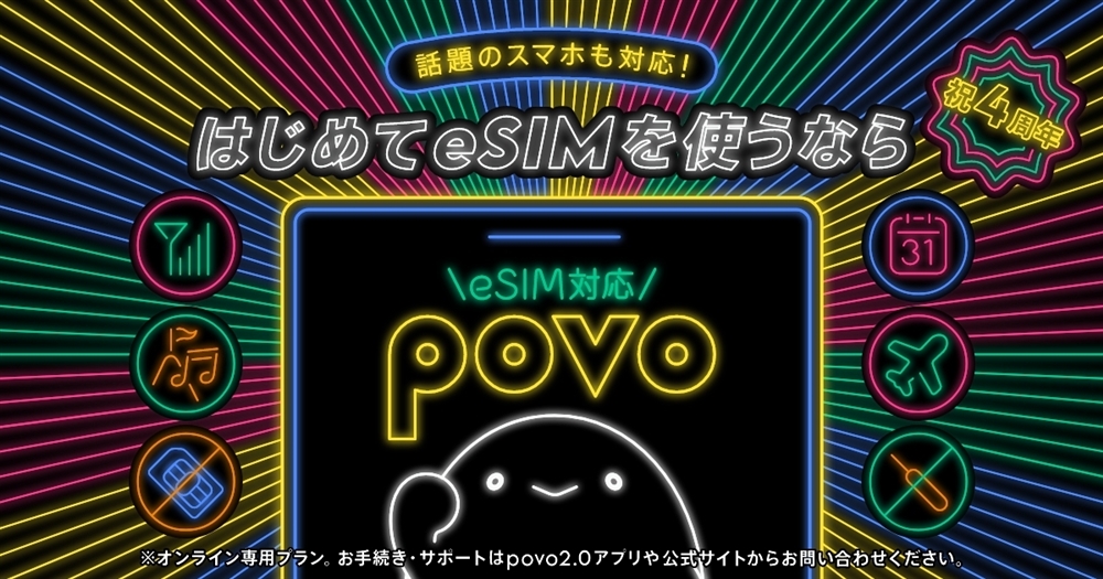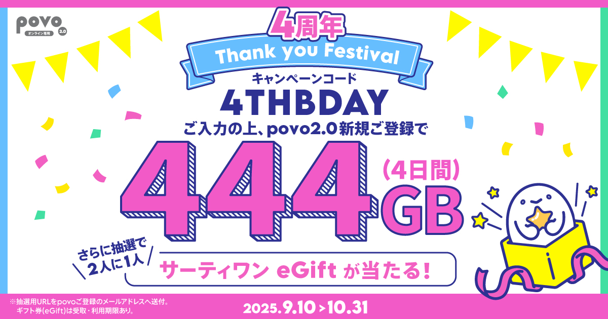 KDDI、沖縄セルラーは2025年9月10日から、povo2.0の4周年を記念した新規登録キャンペーンを実施します。期間中povo2.0に新規登録いただくともれなく444GB(4日間)がもらえ、さらに抽選で「サーティワン アイスクリーム バラエティボックス レギュラー4コ入りギフト券」が当たります。