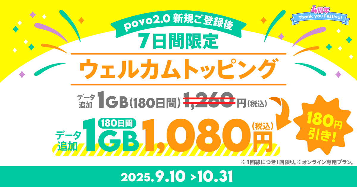 | 1GB(180日間) | 1,080円 | 2025年9月10日00:00~ 10月31日23:59 |