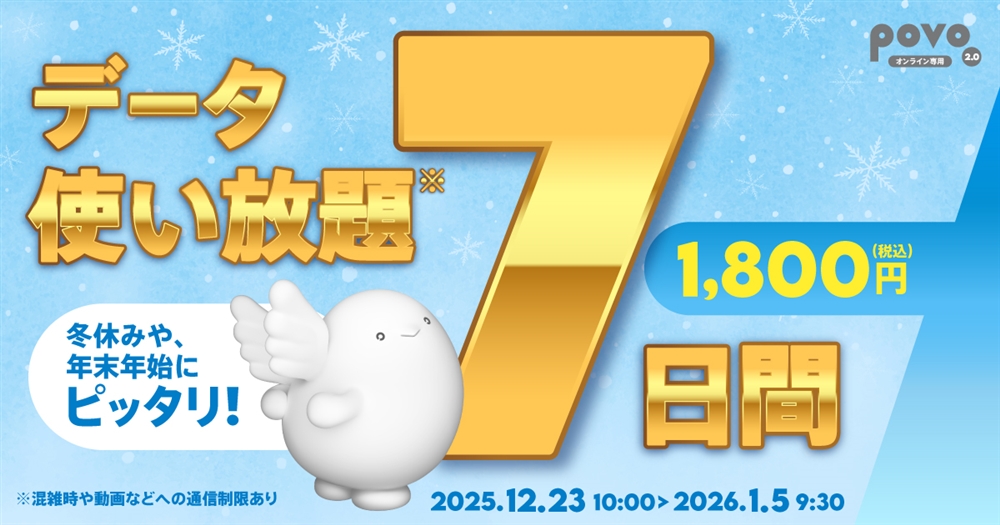 | データ使い放題(7日間) | 1,800円 | 2025年12月23日10:00~ 2026年1月5日9:30 |