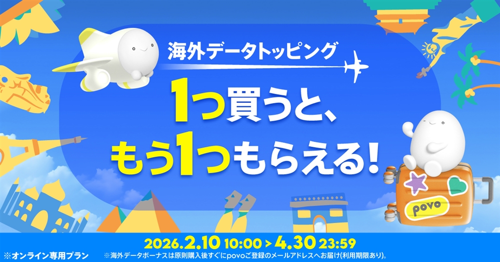 KDDI、沖縄セルラーは2026年2月10日から4月30日まで、povo2.0において、海外データトッピングを買うと、同じ海外データトッピングがもう1つもらえる「海外ローミングキャンペーン」を実施します。1回分の料金で2回分のデータを使用できるため、春休みやゴールデンウィークの海外旅行などでおトクに利用できます。