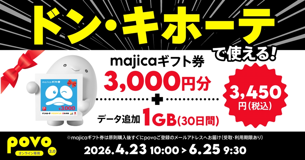 KDDI、沖縄セルラー、KDDI Digital Lifeは2026年4月23日から、povo2.0の「コラボトッピング」として、総合ディスカウントストア「ドン・キホーテ」で利用できる「majica ギフト券3,000円分」と、「1GB(30日間)」がセットになったトッピングを3,450円で提供します。