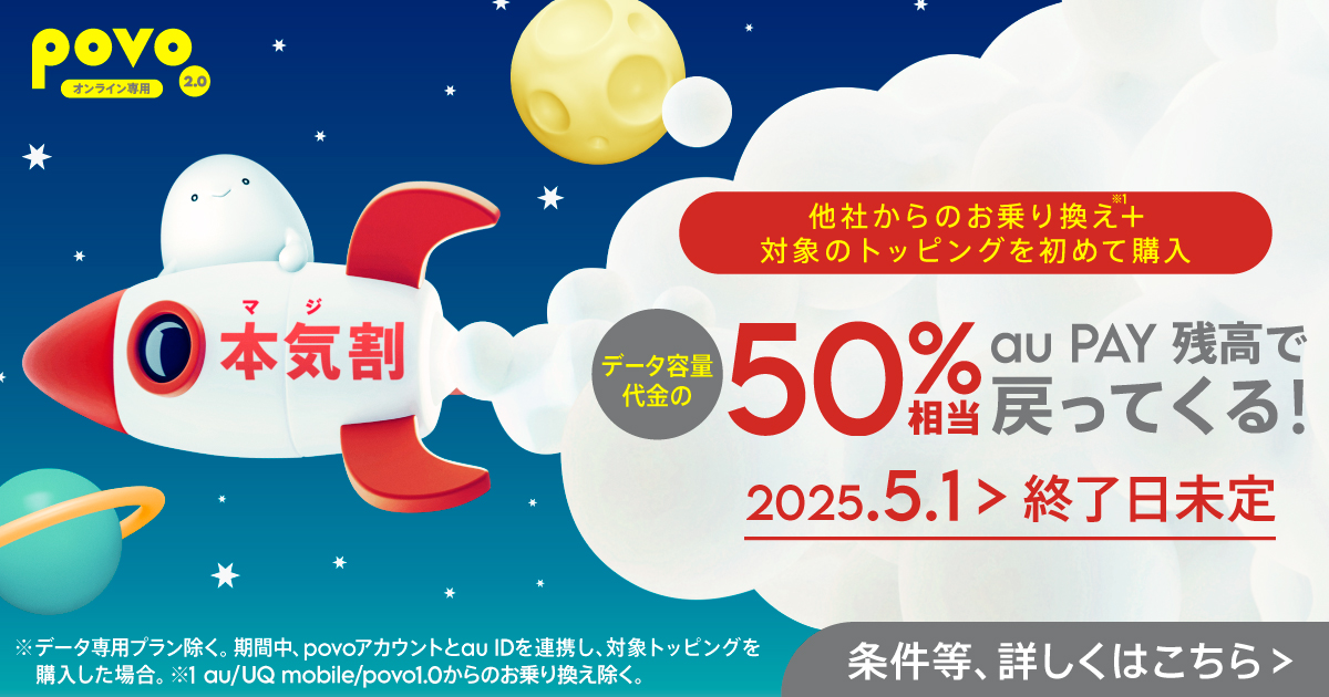 ご利用にはSIMフリーまたはSIMロックを解除したpovo2.0の対応端末が必要です。