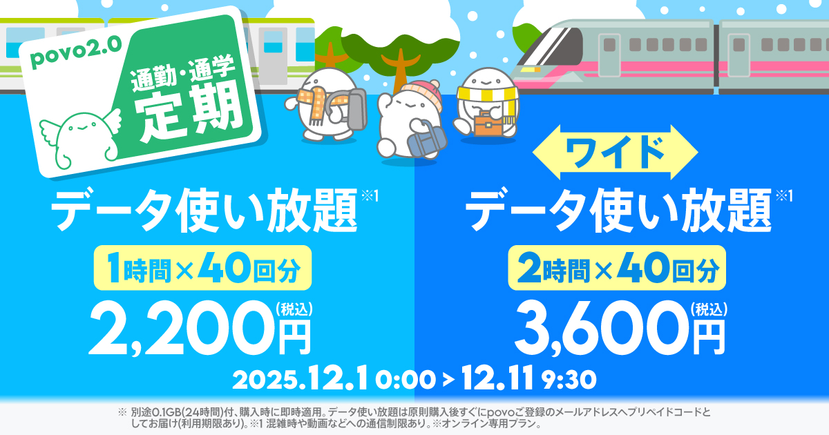 | 「プリペイドコードデータ使い放題※2(2時間)」40回分 | 原則、購入後すぐにメールで送付※3 | 2026年1月31日23:59 | 3,600円 (税込) |