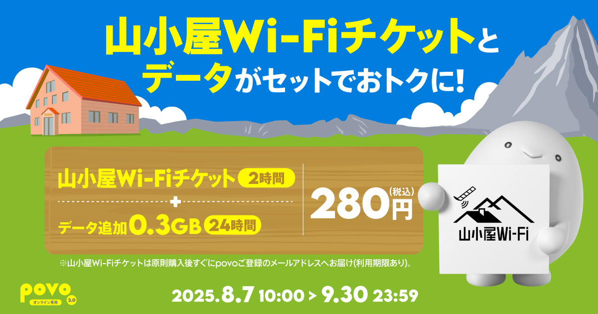 | 申込の利用期限 | ・トッピングを購入できる期間は、「povo2.0アプリ」のトッピング詳細よりご確認いただけます。 ・山小屋Wi-Fiチケットの利用開始期限は2025年11月30日(日)です。ご利用についての詳細はご案内メールをご確認ください。 期限までに山小屋にて、ネットワーク「yamagoya_Wi2」に接続して、利用開始してください。 |