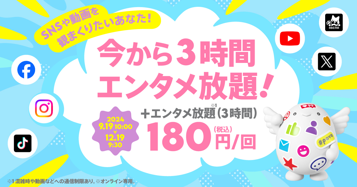 | +エンタメ放題(3時間) | 180円 | 2024年9月19日10:00~ 12月19日9:30 |
