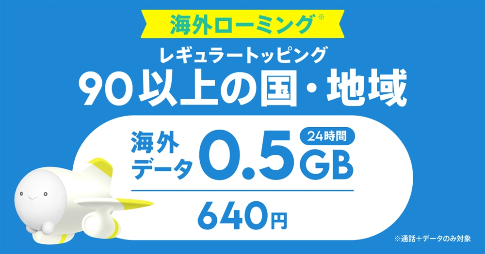 | 【レギュラー】海外データ0.5GB(24時間) | 640円 | 90以上の国・地域 |