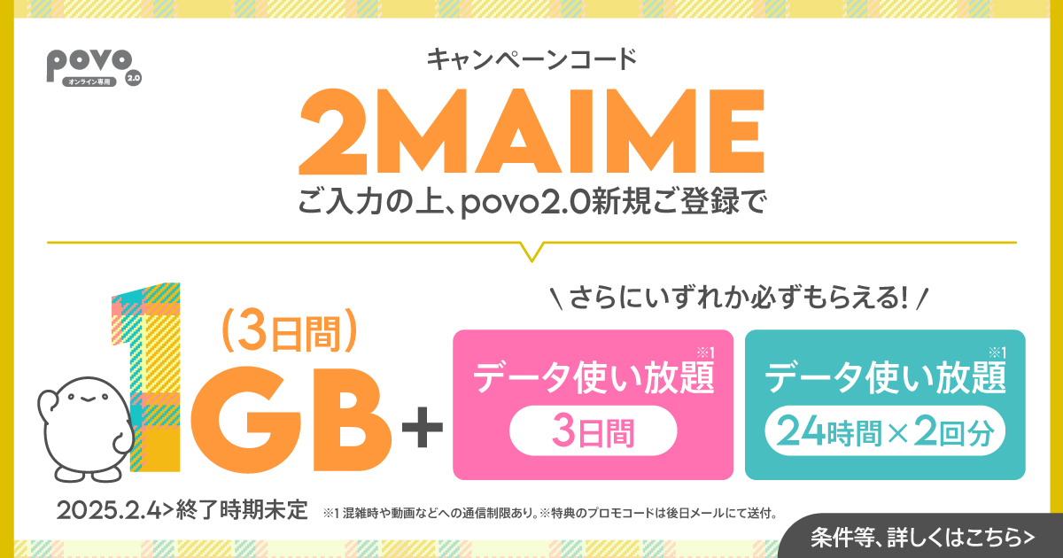 Có thể tiết kiệm hơn khi mua dữ liệu cho dòng phụ thay vì nạp dữ liệu cho dòng chính. Tại povo2.0, "Data Top-up 1GB (7 ngày)" có giá 390 yên/mỗi lần (đã bao gồm thuế).